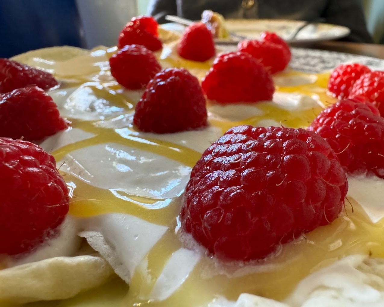 Crepe filled with ham, turkey, cheese, and raspberry jam, dusted with powdered sugar
