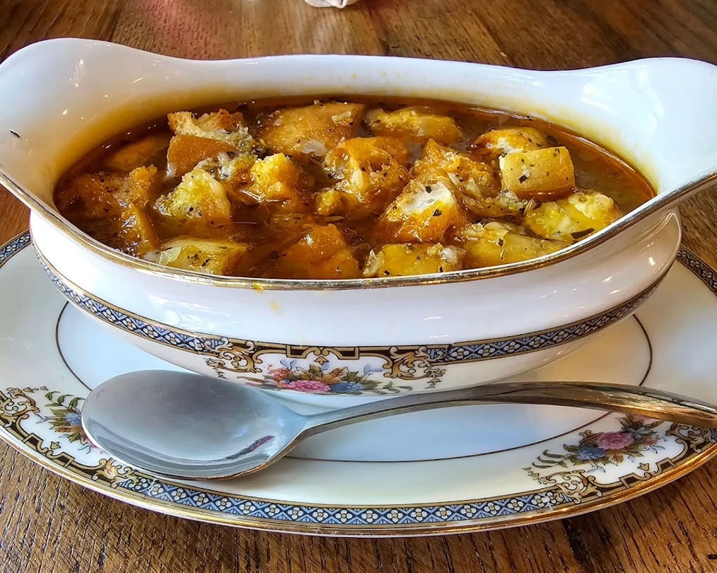 Caramelized onions in a beef broth topped with croutons and gruyere cheese